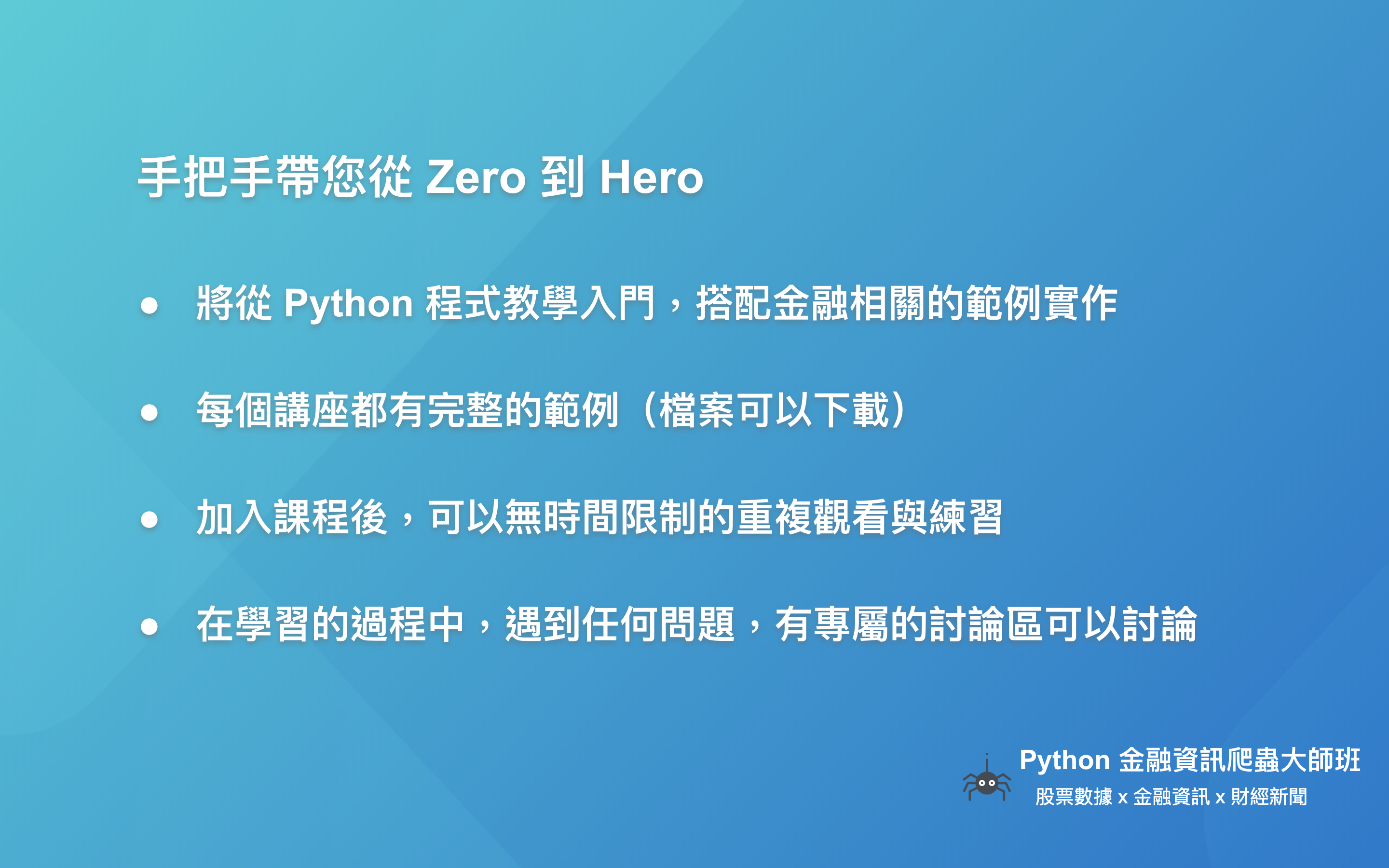 我們將從 Python 程式教學入門開始,搭配金融資訊相關的範例實作,手把手帶您從 Zero 到 Hero,就算您沒有接觸過程式語言,也能夠輕易上手,而且每個講座都有完整的範例可以直接下載,當您加入課程之後,可以無時間限制的重複練習,並沒有任何的時間限制,如果在學習的過程中,遇到任何問題,不用擔心,有專屬的討論區可以討論